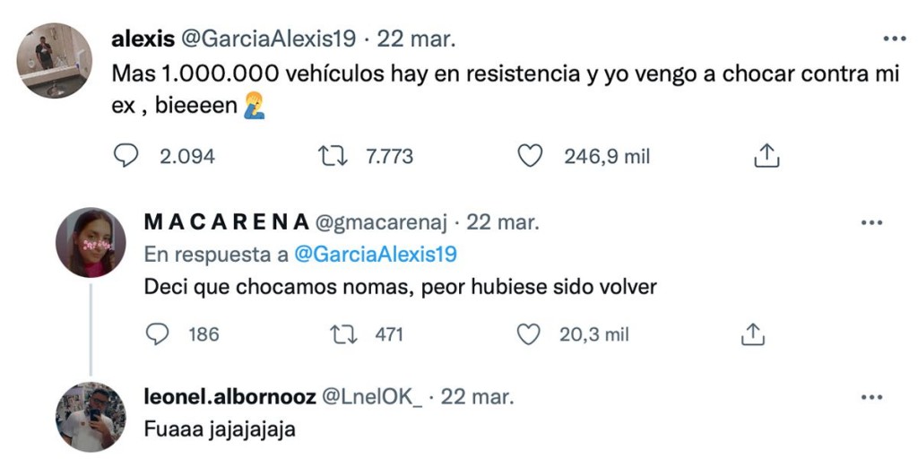A través de su cuenta de Twitter un usuario llamado Alexis García contó que había protagonizado un accidente de tránsito con, nada más ni nada menos que con su ex novia. “Más de1.000.000 vehículos hay en Resistencia y yo vengo a chocar contra mi ex, bieeeen”, escribió en la red social.