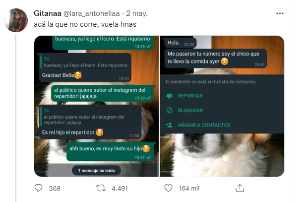 La usuaria de Twitter @lara_antonellaa escribió en su cuenta que "acá la que no corre, vuela hermanas" junto a dos capturas de pantalla de chats en WhatsApp. A través del servicio de mensajería, la chica le avisó a la vendedora que el pedio había llegado: "Buenas, ya llegó el locro. Está riquísimo".