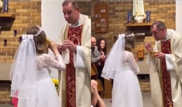 En las imágenes se puede ver a Brynley, de siete años de edad, vestido blanco, velo y corona, que se acerca al sacerdote que le ofrece la hostia. En ese momento ella inclina la cabeza, recibe el pan y lo come. Seguido a eso el sacerdote le presenta la copa de vino sin pensar en lo que vendría después.