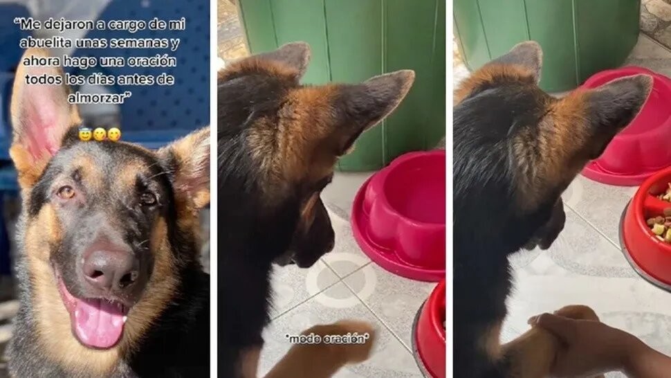 Tras hablar con su abuela, descubrió que el perro aprendió algo cuando estuvo con ella: rezar antes de comer. En el clip, se puede ver al perrito, de raza pastor alemán, se queda quieto frente al plato de comida y hasta se persigna antes de cada alimento.