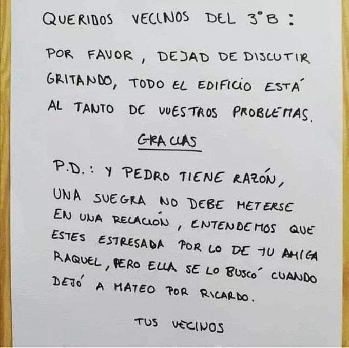 Inquilino se quejó de gritos de sus vecinos a través de un cartel pero además opinó sobre lo que discutían