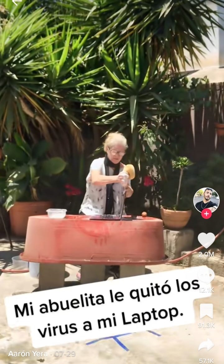El material fue difundido por el usuario Aarón Yera, quien se encontró con su abuela lavando su notebook con agua y jabón y decidió documentar el increíble momento.