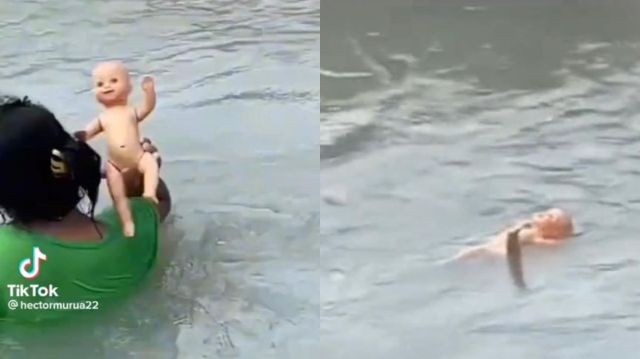 Una muñeca es lanzada al agua y nada sola