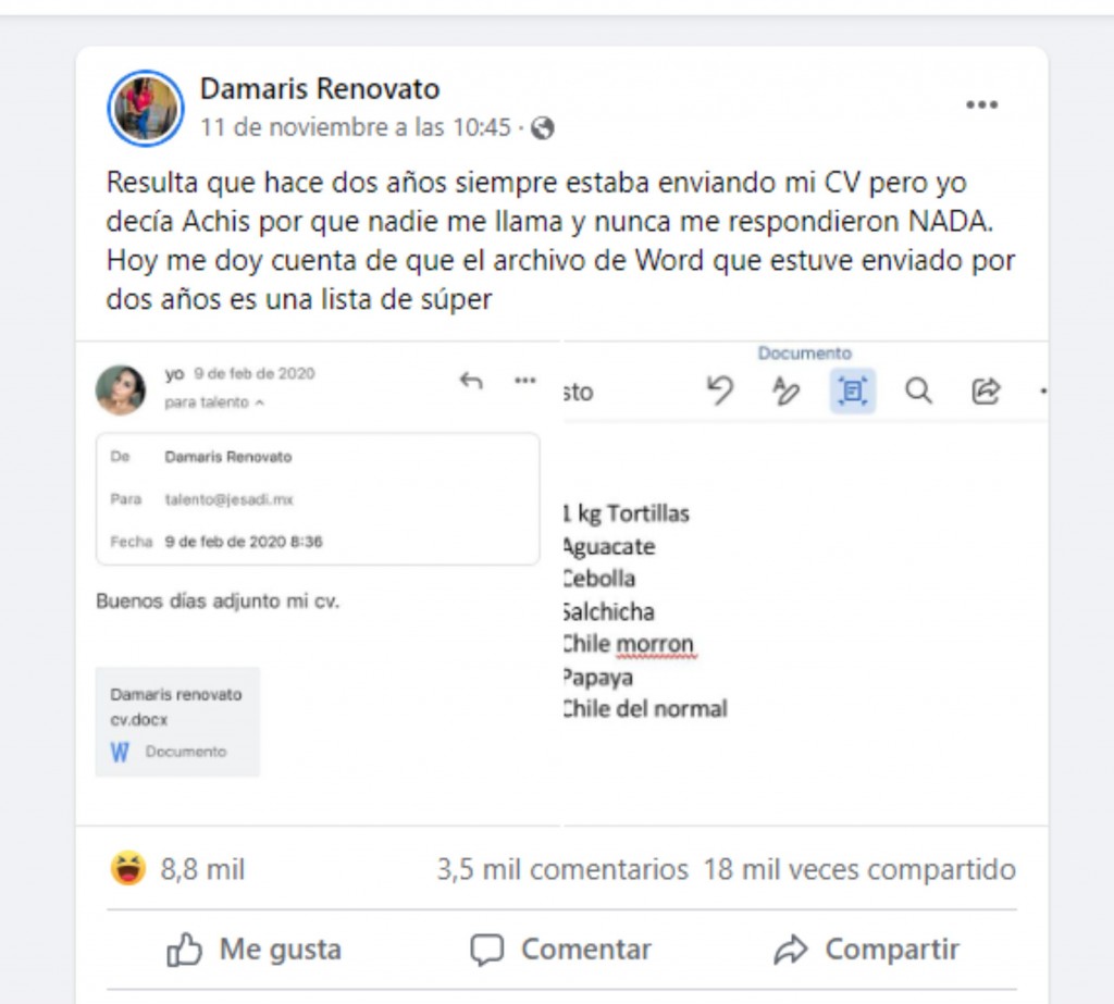 Una usuaria de Facebook reveló el increíble error que cometió al enviar su currículum, motivo por el cual jamás le concedieron una entrevista laboral, y su historia se hizo viral en las redes sociales.