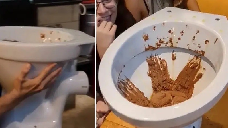 En el clip, un mozo les lleva a un grupo de jóvenes un inodoro en tamaño real con helado de chocolate distribuido por todo el sanitario.