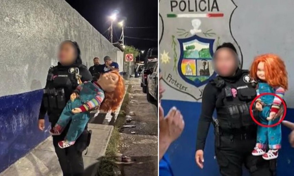Esposado y con un cuchillo aun sobresaliendo de su overol, el muñeco asesino es puesto contra la pared mientras una agente de la policía de México lo sujeta por su brillante cabello naranja.