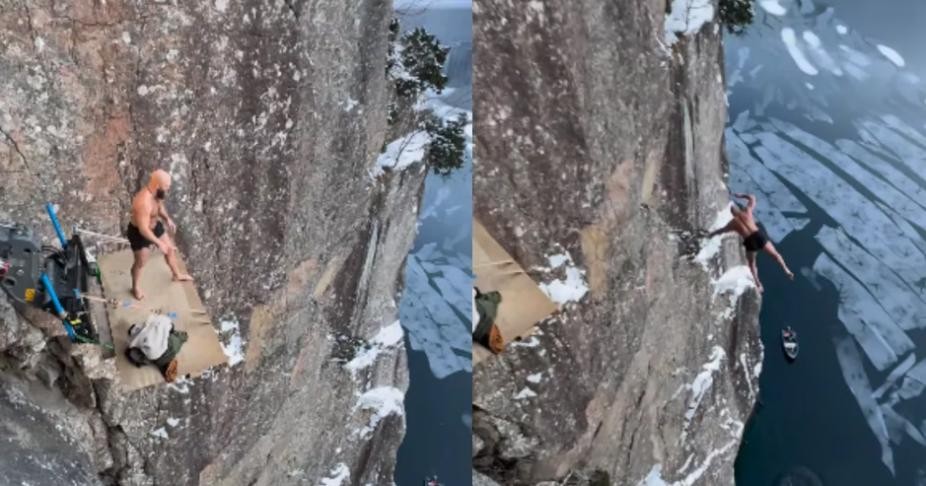 Noruego se tira a un lago con hielo desde 40 metros de altura
