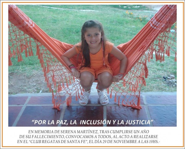 Parientes y amigos de Serena Martínez convocan a una concentración para el 29 de noviembre. Para recordar a la pequeña herida de muerte por un tiro proveniente de Alto Verde, el acto tiene lugar el sábado, a la hora 19, en el club Regatas.