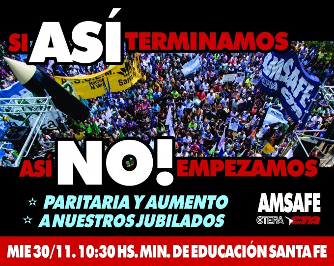A las 10.30, delegados de la Asociación del Magisterio de Santa Fe se movilizan a la sede de la cartera educativa para manifestarse en contra del bono de fin de año propuesto por la Provincia. Además, los docentes públicos solicitan la reapertura de paritarias y un aumento genuino a los jubilados y pensionados.