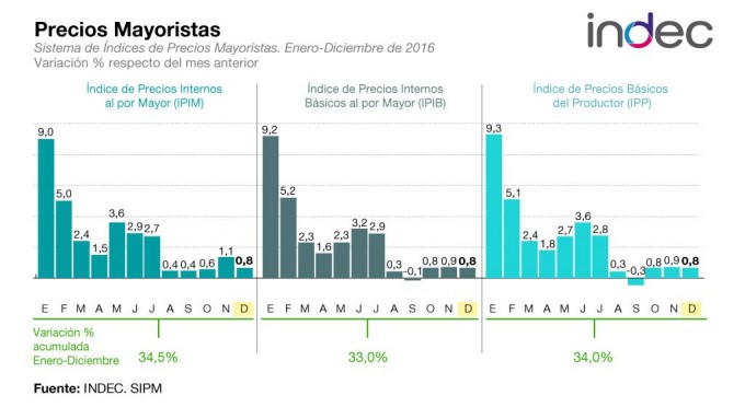 Los precios mayoristas subieron más de treinta y cuatro por ciento en 2016
