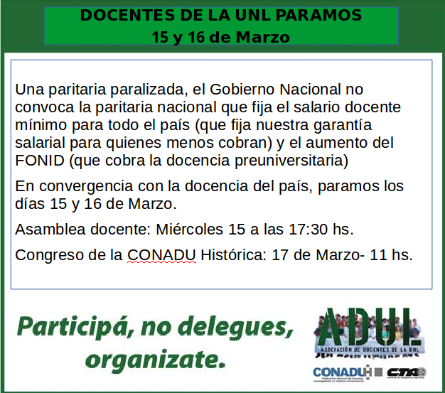 En adhesión a la medida de fuerza prevista por CONADU Histórica, profesores nucleados en ADUL concretan medidas de fuerza por 48 horas, los días 15 y 16 de marzo. Con la protesta, los gremios de docentes universitarios reclaman la realización a una paritaria nacional.