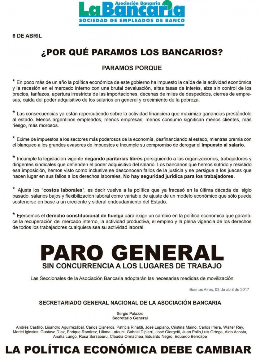 En el marco de la jornada de paro convocada por la CGT, la Asociación Bancaria adherirá a las medidas de fuerza del jueves. La protesta en los bancos se cumplirá sin presencia en los lugares de trabajo.