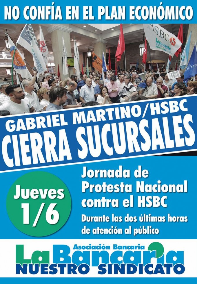 Pasado mañana, el sindicato liderado por Sergio Palazzo concretará medidas de fuerza durante las dos últimas horas de atención al público. La protesta será en repudio al cierre de cinco sucursales del banco HSBC en Luján, Junín, Villa Mercedes, Concepción del Uruguay y Balcarce.