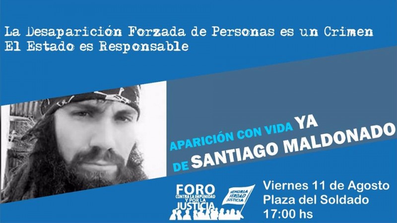 Este viernes, el Foro contra la Impunidad y por la Justicia convoca a una concentración en la Plaza del Soldado para pedir por el joven chubutense, desaparecido luego de su participación en una protesta Mapuche. Precisamente, la movilización por Santiago Maldonado comienza a las 17 horas.